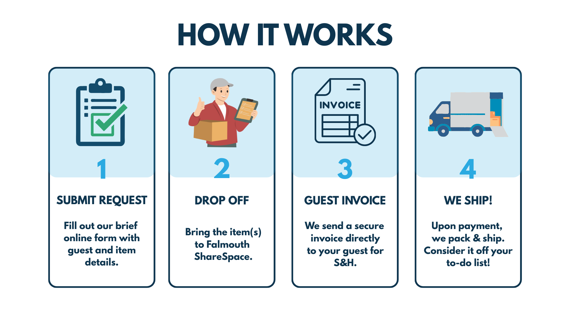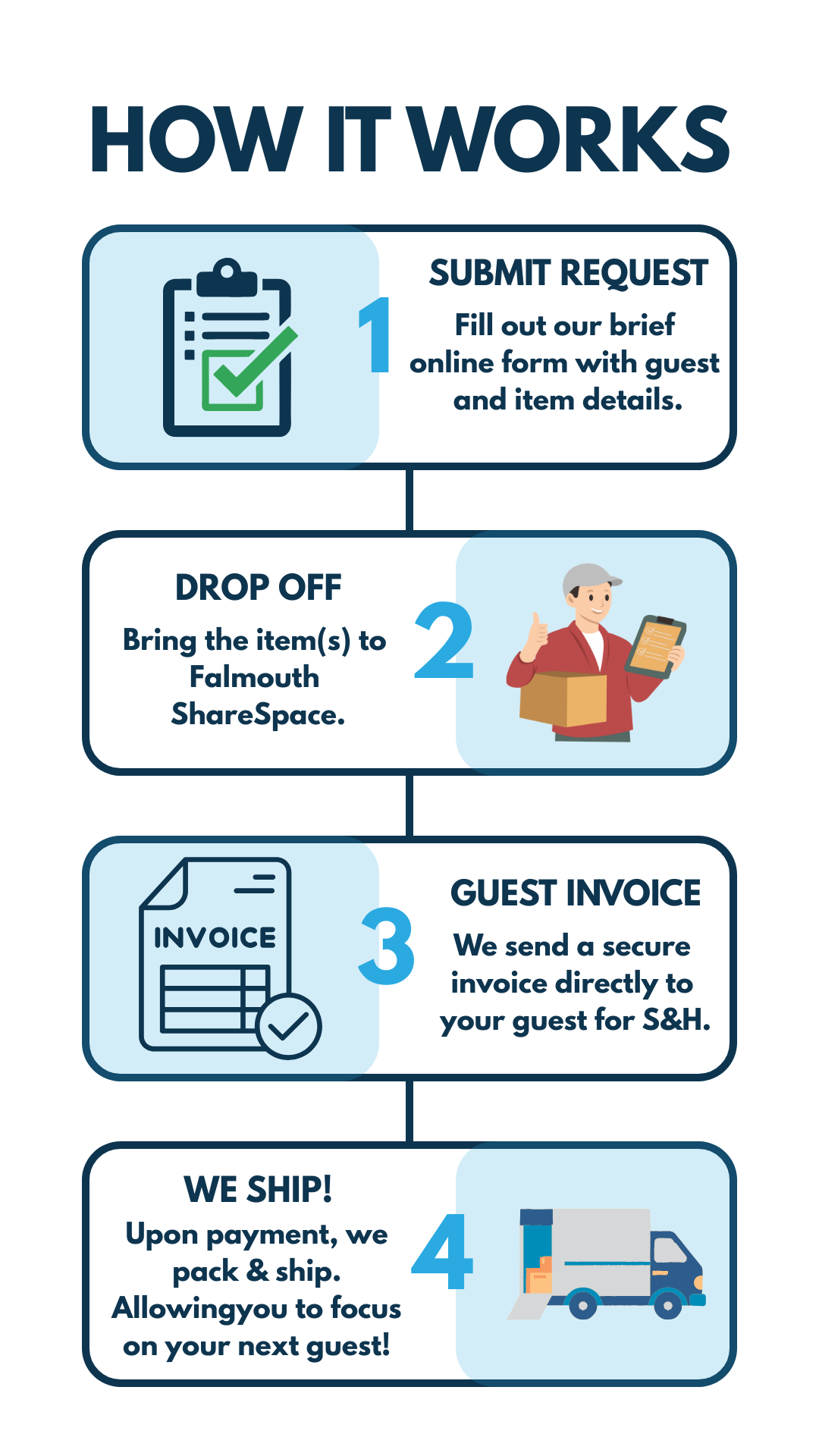 The guest pays. Once you submit the intake form, Falmouth ShareSpace sends a secure QuickBooks Online (QBO) invoice directly to the guest. This invoice covers the carrier shipping fees plus our professional handling and packing fee. There is zero cost to you as the host.